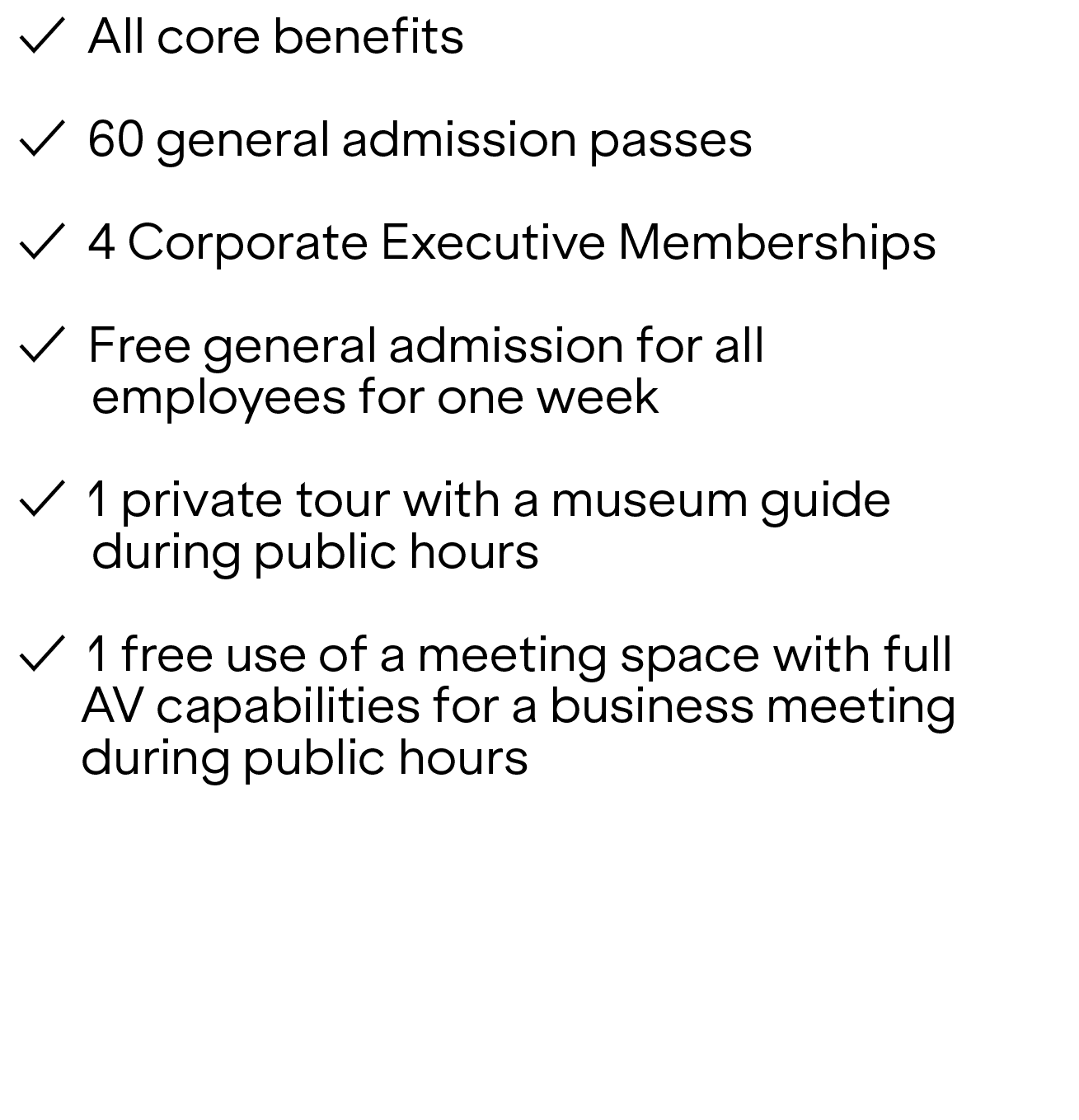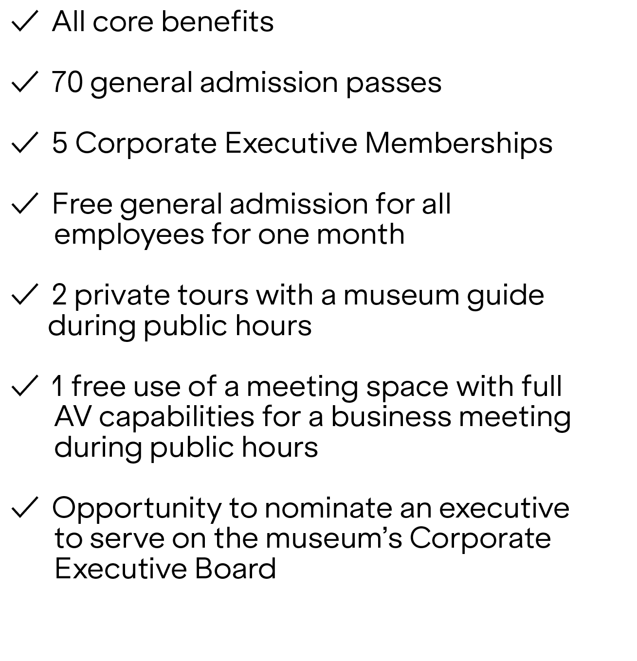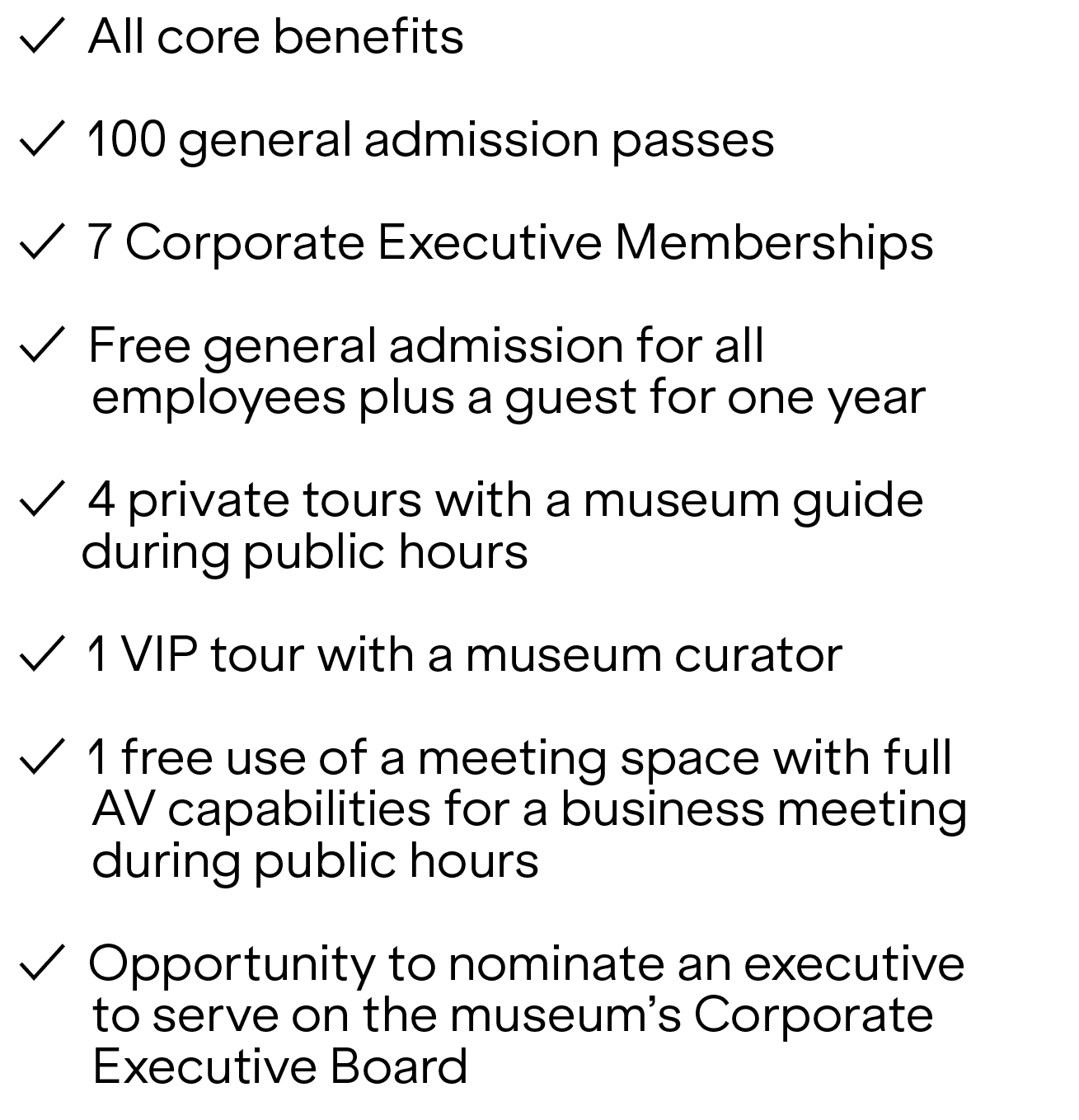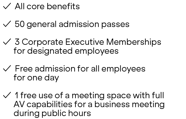 Each membership level offers exclusive benefits, including participation on our Corporate Executive Board, complimentary general admission, guided tours, networking and entertainment opportunities, discounts, and more.